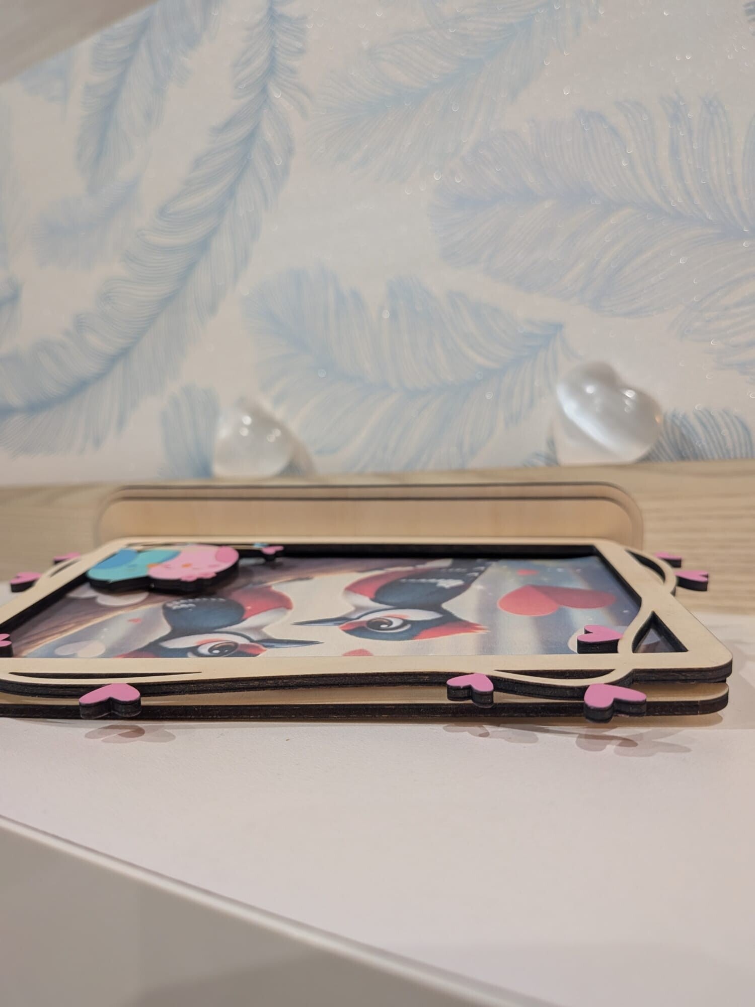 Ajoutez une touche de douceur à votre décoration avec ce magnifique cadre photo en bois. Orné de petits oiseaux mignons et de cœurs roses, il apporte une touche romantique et chaleureuse à votre intérieur.